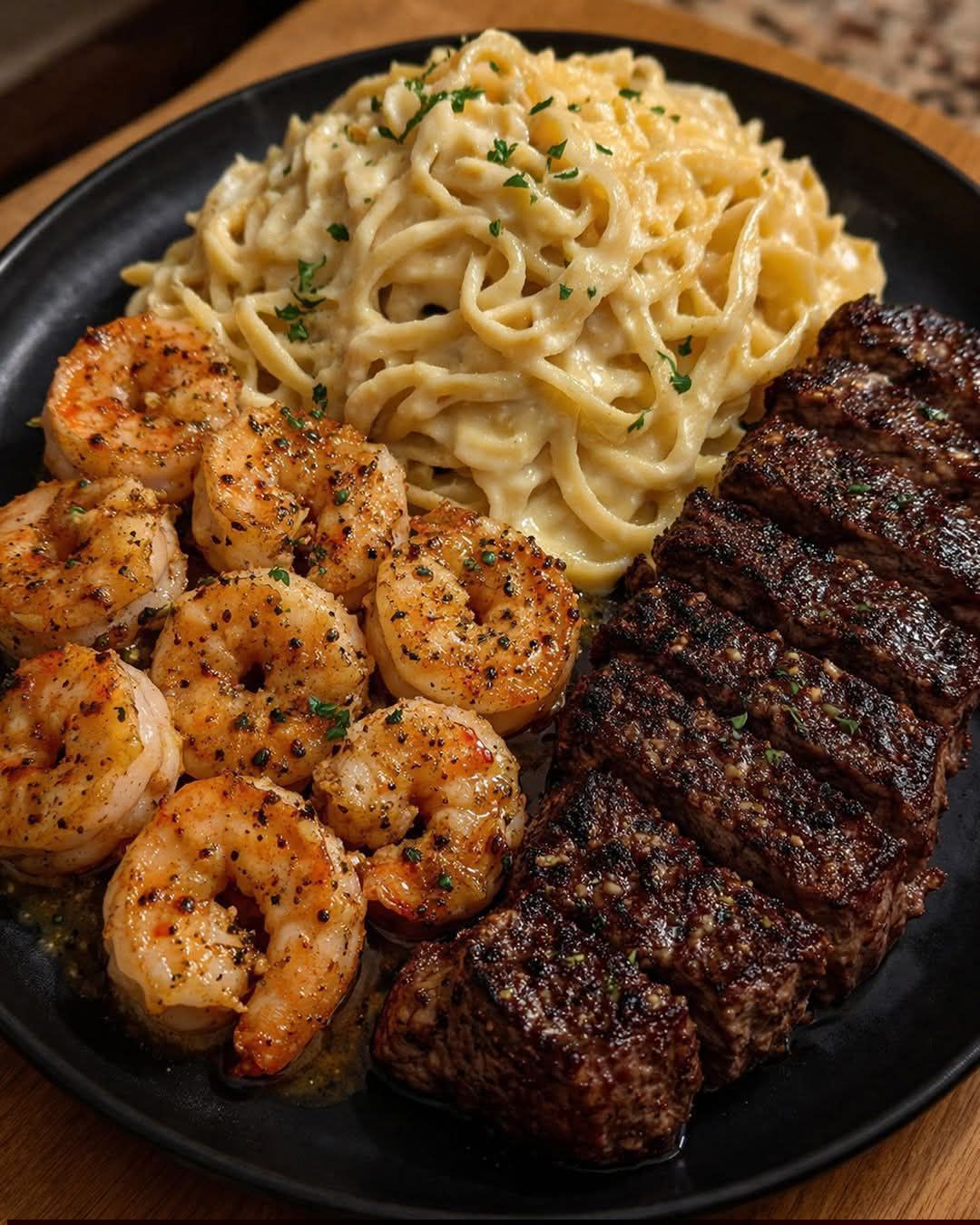 CAJUN SHRIMP AND STEAK ALFREDO PASTA