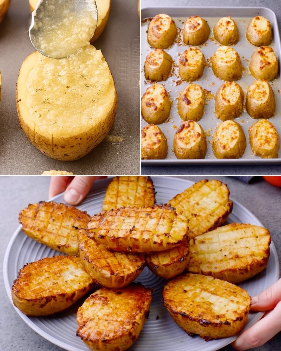 Spuds, taters, potahto…whatever you call them, we love them! The humble potato is one of the most versatile vegetables. You can boil the, fry them, or bake them, and they always end up delicious. In this recipe, we’re taking baked potatoes to the next level. These Baked Potatoes are made with butter, garlic, and parmesan, which means they’re packed with flavor. They’re perfectly crispy on the outside and soft and fluffy on the inside. And they’re so easy to make! Because they’re baked instead of fried, it’s less messy to make and is also easier to scale up if you’re cooking for a crowd. If you love carbs, you will love this recipe!