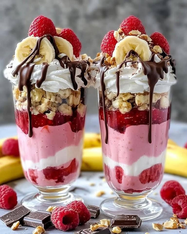 A creamy, dreamy milkshake inspired by the classic banana split—layered with strawberry and vanilla flavors, topped with decadent garnishes!
