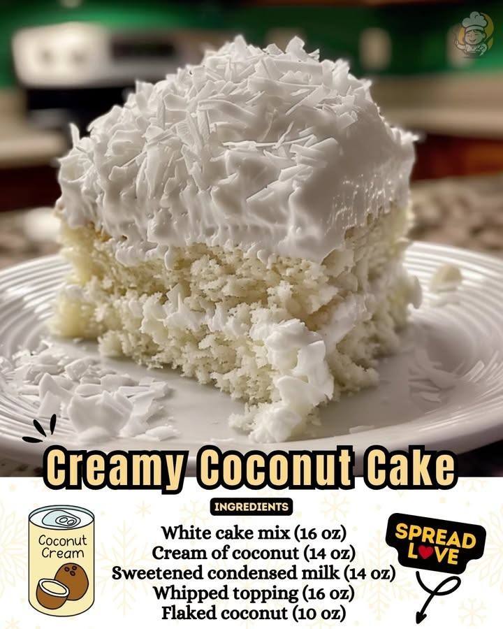 This Delicious Creamy Coconut Cake is a tropical, melt-in-your-mouth dessert that’s shockingly easy to make. A fluffy white cake gets soaked with sweet cream of coconut and condensed milk, then topped with billowy whipped topping and a snowstorm of coconut flakes. It’s cool, creamy, and perfect for parties, potlucks, and make-ahead treats.