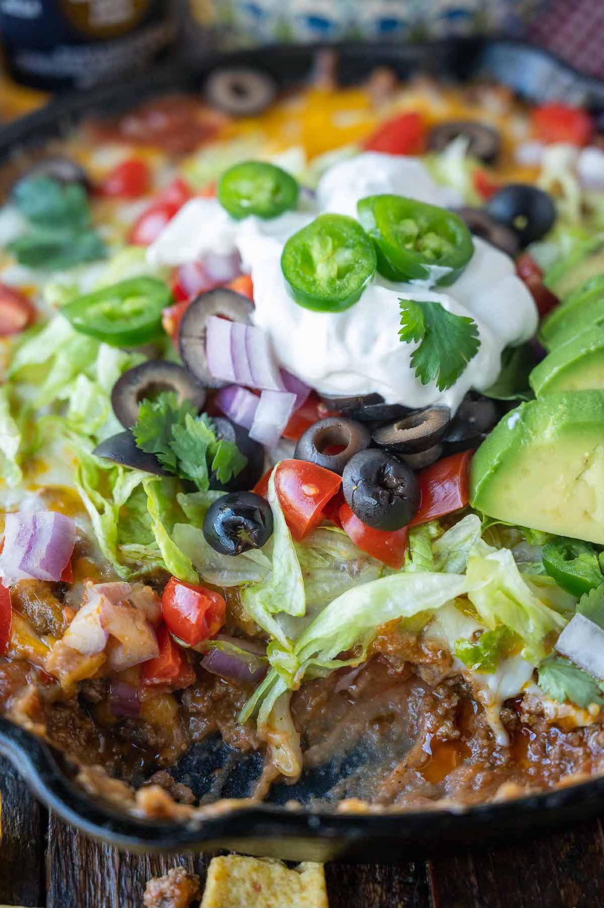 This hot, cheesy, and fully-loaded dip is a guaranteed crowd-pleaser. Baked in a skillet for a rustic presentation, it’s layered with seasoned beef, beans, and a cool, fresh topping.
