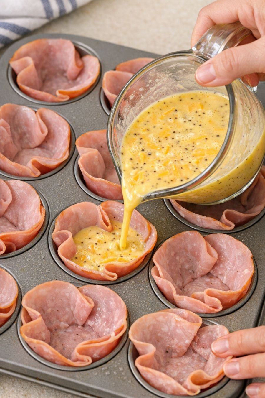 Pour this 1 whisked mixture into slices of deli ham into a muffin tray for a low carb breakfast that keeps you full longer than expected