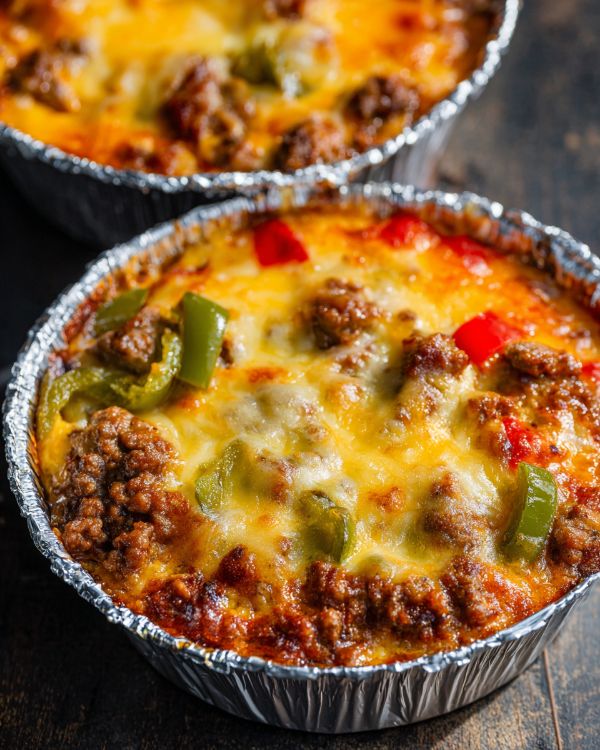 Divide the beef and pepper mixture evenly into two individual-sized aluminum foil pans.